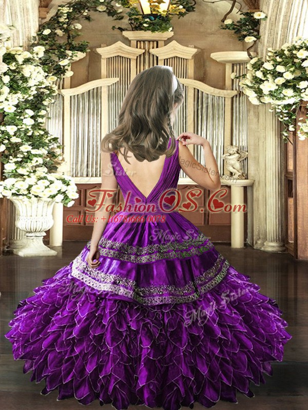Eggplant Purple Backless Pageant Dress Wholesale Beading and Appliques and Ruffles and Ruching Sleeveless Floor Length