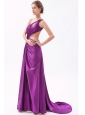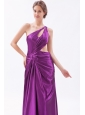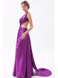 This is the unique dress you've been waiting for. A sparkling short purple dress featuring a one shoulder bodice with an asymmetrical neckline and a keyhole opening at the middle of the bust, side cut-out, and dainty ruching. The flowy, gorgeous skirt, the half open back with straps all beaded and the brush train continues the charm of this dress. The grace is all in the details of this gorgeous dress that is perfect for prom or any formal occasion.