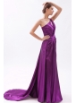 Home >  Evening Dresses > Eggplant Purple Column Asymmetrical Brush Train Chiffon Ruch and Beading Evening Dress