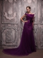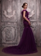 Eggplant Purple Mermaid Off The Shoulder Brush Train Tulle Hand Made Flowers Prom / Evening Dress