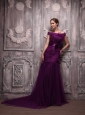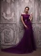 Home >  Prom Dresses >  Discount Prom Dresses > Eggplant Purple Mermaid Off The Shoulder Brush Train Tulle Hand Made Flowers Prom / Evening Dress