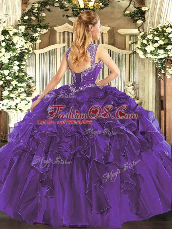 Eggplant Purple Organza Lace Up 15 Quinceanera Dress Sleeveless Floor Length Beading and Ruffles