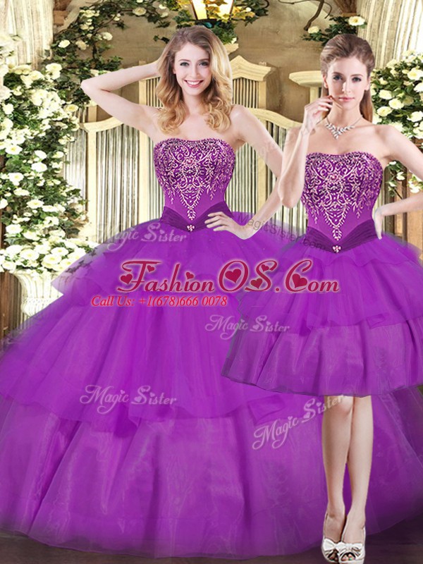 Home >  Quinceanera Dresses >  Detachable Quinceanera Skirts > Eggplant Purple Sweet 16 Quinceanera Dress Military Ball and Sweet 16 and Quinceanera with Beading and Ruffled Layers Strapless Sleeveless Lace Up
