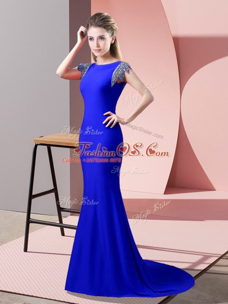 Elastic Woven Satin High-neck Short Sleeves Brush Train Backless Beading Evening Dress in Royal Blue