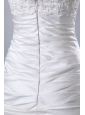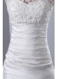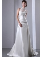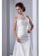This kind of wedding dress features its special halter-top neck design in A-line silhouette. The A-line dress features a shape that is fitted around the bodice and flows out to the ground, resembling the outline of an uppercase A. Fantastic embroidery in the bust and tidy ruches in the waist add elegance to this beautiful gown. Due to its classic and simple style, the A-line dress is appropriate for any occasion, from a quiet backyard gathering, to a traditional church ceremony.
