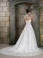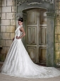 Wedding gowns with lots of lace details are most romantic. This one features a beautiful lace covering and a halter top neckline. The A-line skirt features a gorgeous lace overlay as well which stretches into a delicate cathedral-length train in the back. The shear lace neckline specialize the style.A corset-style closure secures the dress in place and completes the design. An absolutely perfect gown when looking your best is a must.