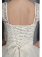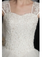 This angelic wedding dress features sweetheart neckline, which adds interest to the bust line which the beaded lace bodice draws the eye higher. The gathered half-cap straps are just enough to hold the top of the dress perfectly in place, the outlayer lace spread out like a flower and extends to a chapel train, the back of the dress has a grace lace up closure.