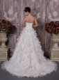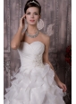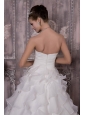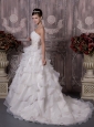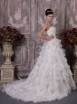 This white sweetheart wedding dress will make you the most beautiful bride in the world. It features a lovely pleated bodice with gathered beaded decoration on the left side of waist.The skirt is made of several tiers of ruffled fabric, which gives it a great shape and allows for a beautiful silhouette and extends into a ruffled train in the back