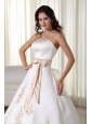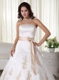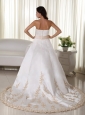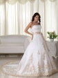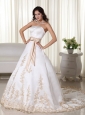 Shop our extensive collection of designer wedding dresses and gowns online today. Beautiful bridal dresses at incredible prices. This kind of wedding dress features its fitted waist design, appoliques decorated on the bodice. Zipper up back. It is elegant and grace for bridals.