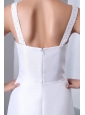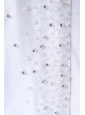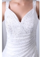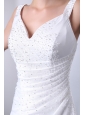 This kind of wedding dress features its V-neck design in A-line silhouette with beading. The dress flows fluidly from the bust to the hem with an unbroken line. Moderate beads in the bodice and the straps, carefully organized ruches over the waist, and fitted zipper up back make the dress extremely delicate. Due to its classic and simple style, the A-line dress with round train is appropriate for any occasion, from a quiet backyard gathering, to a traditional church ceremony.