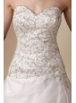 This elegant wedding dress features a strapless sweetheart neckline and a heavily beaded bodice. The a-line skirt starts right under the hips, flows to the floor and gathers to form a lovely train. A zipper up back finishes the look.