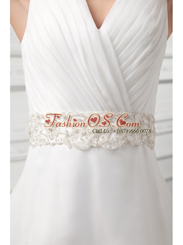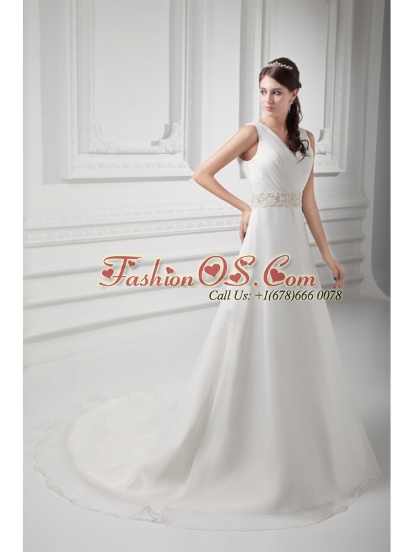 Elegant A-line V-neck Court Train Wedding Dress with Beading and Ruching