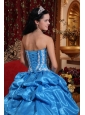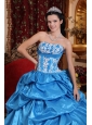 This blue quinceanera dress features a special bodice which is strapless neckline with the bustline accented with a band. The whole bodice is decorated with embroidery. The pick ups on the skirt make it look like many layers, adding interest to the dress. A lace up corset style closure in the back secures the dress in place.
