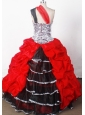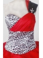 The dramatic and sassy one-shoulder printed taffeta ball gown with sweetheart neckline features a fitted bodice with asymmetrical colors and straps.The empire skirt is full and has a colorful split back overlay and a trendy animal print hem is flirty and fun.
