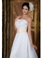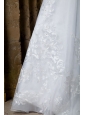 The one who loves romance will adorn this perfect wedding gown. The fabulous gown features a fashionable strapless neckline with beaded embroidery adorns on the corset bodice. Banded sash with ruching in contrasting color accents your figure charming. Similar delicate embroidery is also employed on the A-line skirt to make the dress more favorable. Hidden zipper up with fastener decoration on the back add the charm and secures the dress in place. A chapel train is the dream of every lady!