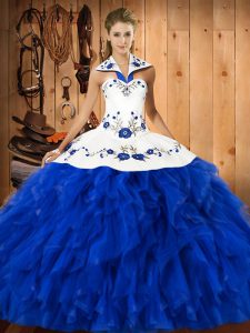 Elegant Blue And White Sleeveless Floor Length Embroidery and Ruffles Lace Up Quinceanera Dress