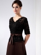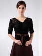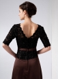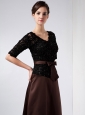 Exquisite is the most exact word to describe this dress! It combines seductive lace and elagant satin to build such a elegant and fabulous dress. The dress accents a half-sleeves V-neck bodice and the lovely beadings adorned in the bodice to make the already elegant dress more sassy! The glossy satin sash is embellished with a cute bowknot which decorates the dress to the point! A column-style skirt finishes a gorgeous look.