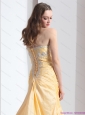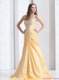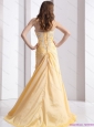 Elegant Brush Train Gold Prom Dresses with Ruching and Beading