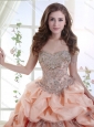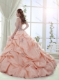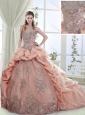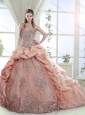 Elegant Brush Train Peach Quinceanera Gown with Appliques and Bubbles