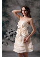 A flattering cut combined with the luxury of organza gives this strapless short dress a ravishing style that will be the envy of everyone at homecoming or graduation. A strapless teen homecoming dress in champagne featuring a weaved strapless bodice with a straight neckline and a loose fitting short skirt.Especially the hand made flowers on the whole skirt and the ruched fabric on the edge of the skirt give the dress a feeling of fresh and nature.