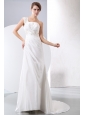 Dramatic touches include the single strap will have heads turning the moment you arrive. This soft and romantic wedding dress features a one-shoulder strap accented with shimmering beaded florals alone the waistline and over-all pleated satin creates a flattering shape. The eye-catching court train gently touches the floor giving a sens of luxury.