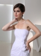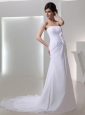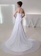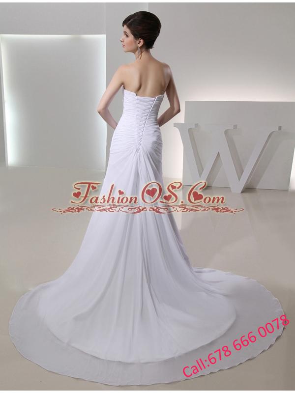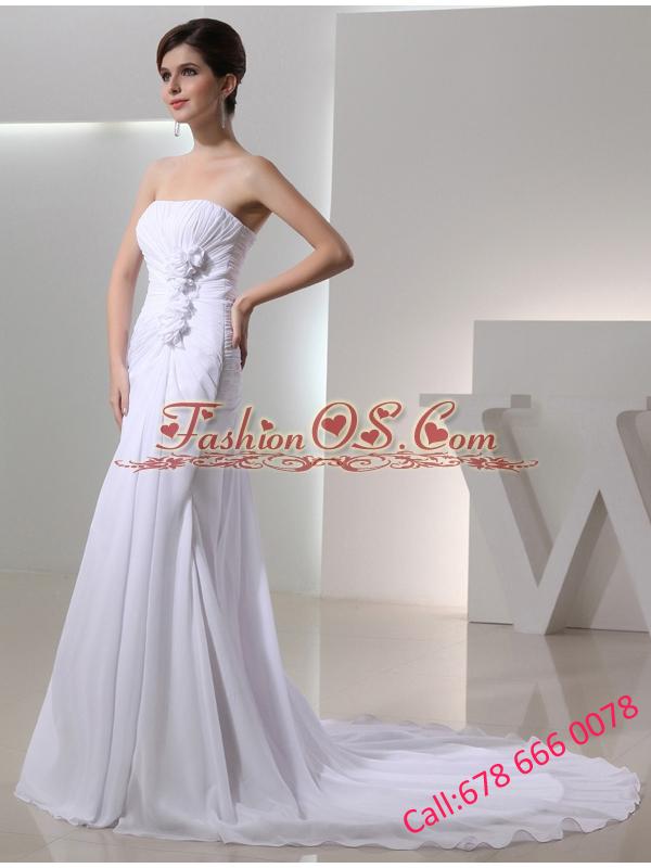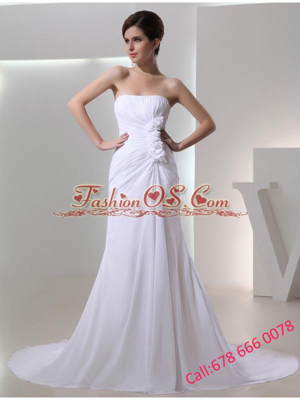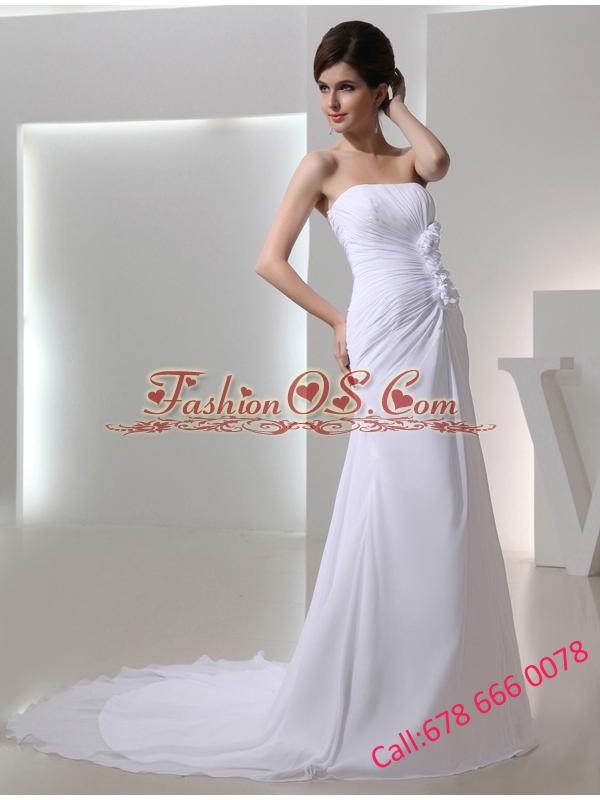 Elegant Column Strapless Court Train Chiffon Ruching White Wedding Dress in 2014