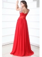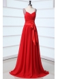 Elegant Column V-neck Red Brush Train Chiffon Prom Dress with Beading