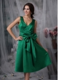 Elegant Dark Green Knee-length Bridesmaid Dress A-line V-neck Satin Bow Tea-length