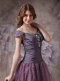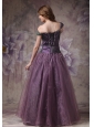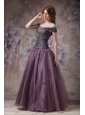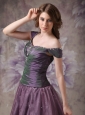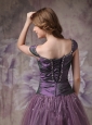 Twirl and whirl your way to an unforgettable evening in this festive, stunning purple prom dress! This dress is made in two contrasting fabric- bodice in taffeta and bottom in organza. The fitted bodice is adorned with off-the-shoulder style, exquisite appliques and embellished beadings that curve your natural waistline. While the floor length skirt in layers flows freely and a lace up in the back completes the look.