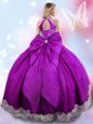 Home >  Quinceanera Dresses >  Popular Quinceanera Dresses > Elegant Eggplant Purple Ball Gowns Halter Top Sleeveless Taffeta Floor Length Lace Up Beading and Bowknot Ball Gown Prom Dress