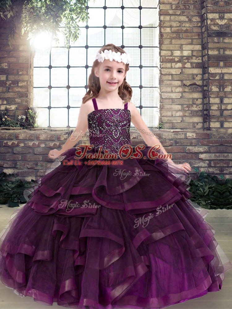 Elegant Eggplant Purple Ball Gowns Tulle Straps Sleeveless Beading and Ruffles Floor Length Lace Up Little Girls Pageant Dress Wholesale