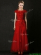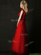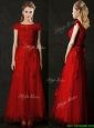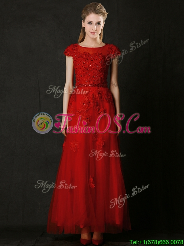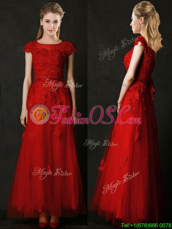 Elegant Empire Applique Red Prom Dress with Cap Sleeves