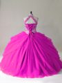Elegant Fuchsia Quinceanera Dress Sweet 16 and Quinceanera with Beading Halter Top Sleeveless Lace Up