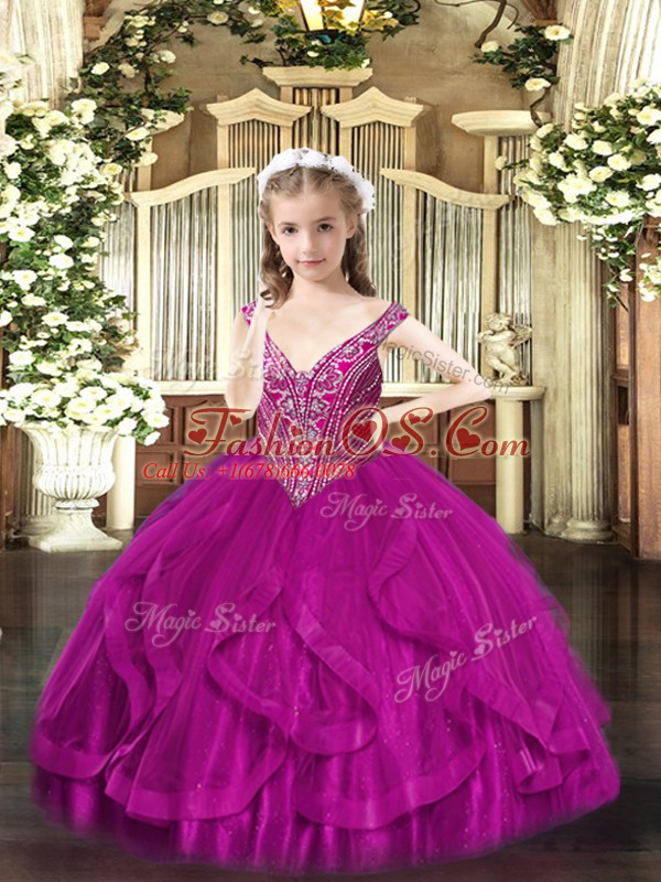 Home >  Special Occasion Dresses >  Pretty Little Girl Pageant Dresses > Elegant Fuchsia Sleeveless Beading and Ruffles Floor Length Kids Formal Wear