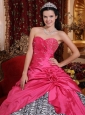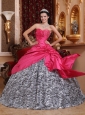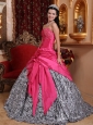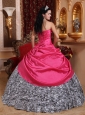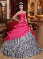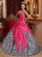 Stunning and dramatic! This hot pink, strapless quinceanera dress will make you become the spotlight in any occasion.The bocdice is accented with a sweetheart neckline and lovely beadwork.The flower decoration in the middle section is so chic that make the dress fabulous,while the zebra print skirt is simple yet gorgeous to give you sense of delicate beauty.A lace up back completes this wonderful design.