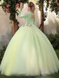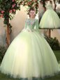 Elegant Light Yellow Ball Gowns Scoop Long Sleeves Tulle Floor Length Lace Up Appliques Quince Ball Gowns