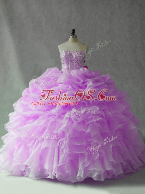 Elegant Lilac Lace Up Strapless Beading and Ruffles and Pick Ups Quinceanera Dress Organza Sleeveless Brush Train