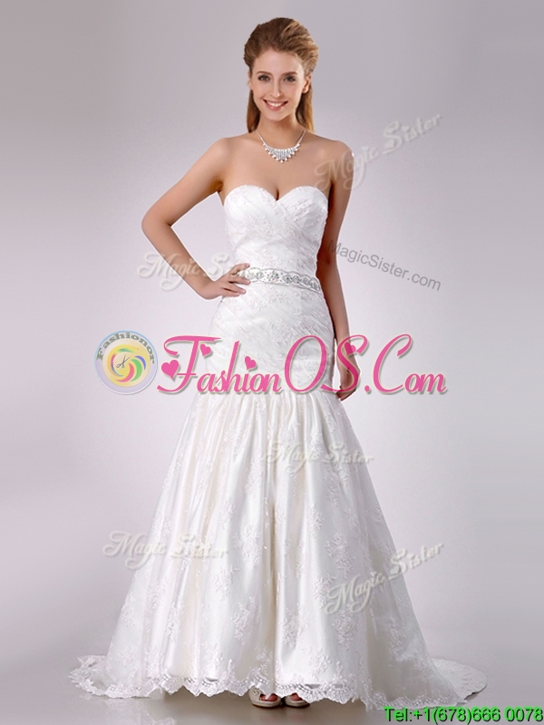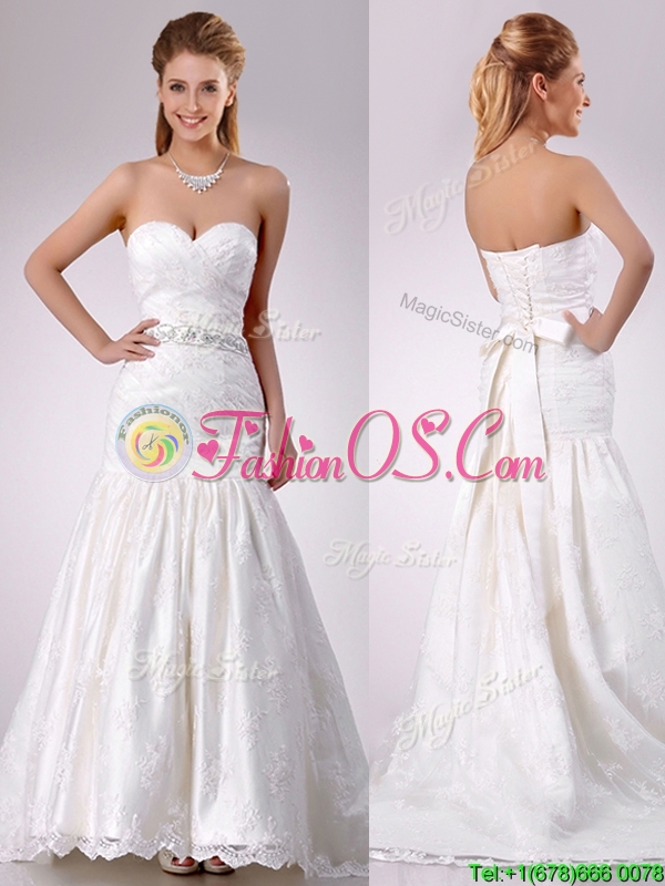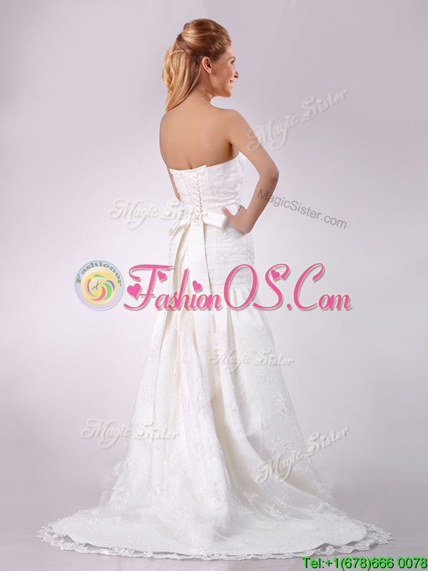 Elegant Mermaid Beaded and Bowknot Laced Wedding Dress with Brush Train