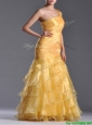 Elegant Mermaid One Shoulder Organza Ruffled Prom Dress in Gold