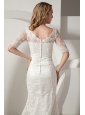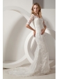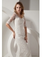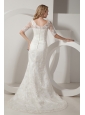 This elegant white wedding dress is perfect for you! It features a sweetheart neckline with see-through lace sleeves. Exquisite lace fabric covered whole dress makes this dress looks luxurious. The skirt falls to the floor and extends into a beautiful chapel train. Hidden zipper up back creates a sense of myth. You will not forget the day when you wear this dress!