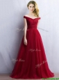 Elegant Off the Shoulder Cap Sleeves Bridesmaid Dress in Wine Red