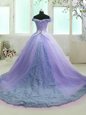Elegant Off the Shoulder Hand Made Flower 15 Quinceanera Dress Lavender Lace Up Short Sleeves With Train Court Train