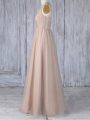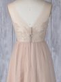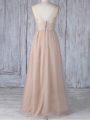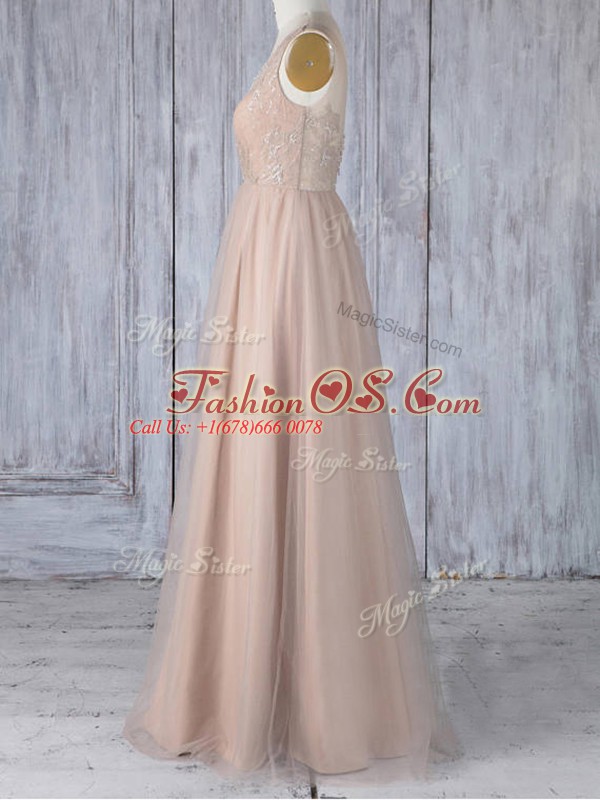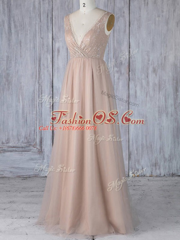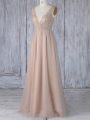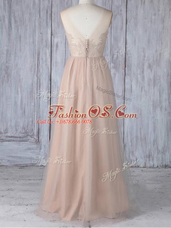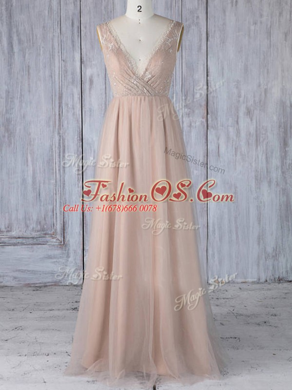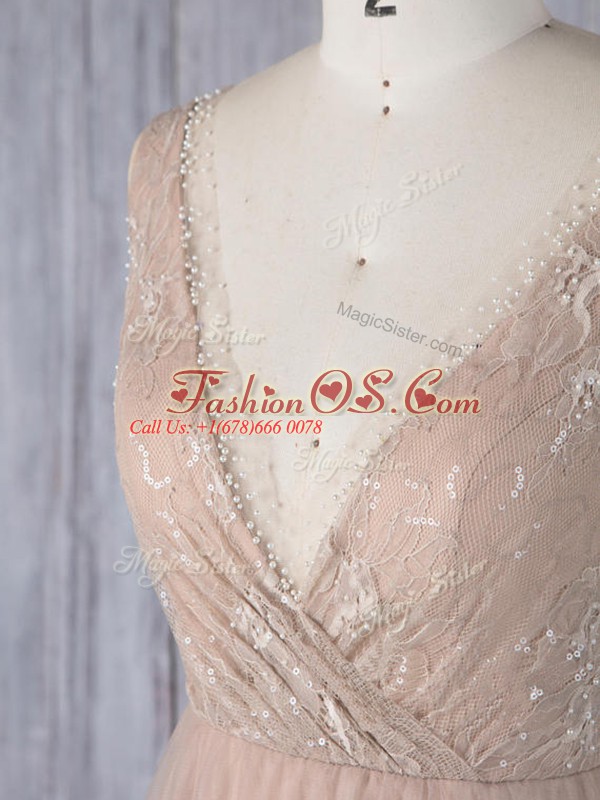 Elegant Peach Zipper V-neck Lace Bridesmaids Dress Tulle Sleeveless