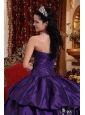 This vintage and elegant purple quinceanera dress features a ruched bodice, which encrusted with a delicate applique.Its strapless sweetheart neckline bodice combined with a ruffled skirt to creat an image of Bella Sara. Flirty layers of teffeta ruffles start form the dropped waist to create a luxury skirt for this eye-catching dress for prom or party. This dress is available in the colors shown on the color palette.