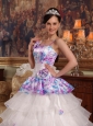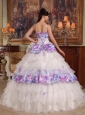 This quinceanera dress is gorgeous! Opulence is the word written all over this dress. It features a spaghetti Straps bodice with a classic floral printed fabric. A white organza sash with a conspicuous flower on the waist adds interest and detail to the mid-section of the dress. The full skirt is dazzling with series of ruffles that begins at the waistline and envelopes the legs in luxurious tulle in a pretty cake-like shape.A floral printed lace up completes the back.