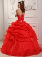 Red a-line organza quinceanera dress strapless design with ball gown silhouette.Flowy ruffles in extravagant draping down the skirt.Stunning tulle adorns the a-line ball gown skirt. Lace up back is fabulous on this gown.?An absolutely perfect gown when looking your best is a must.