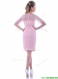 Elegant Ruched and Laced Square Baby Pink Mother of the Bride Dress with Half Sleeves
