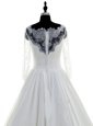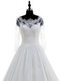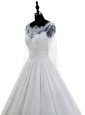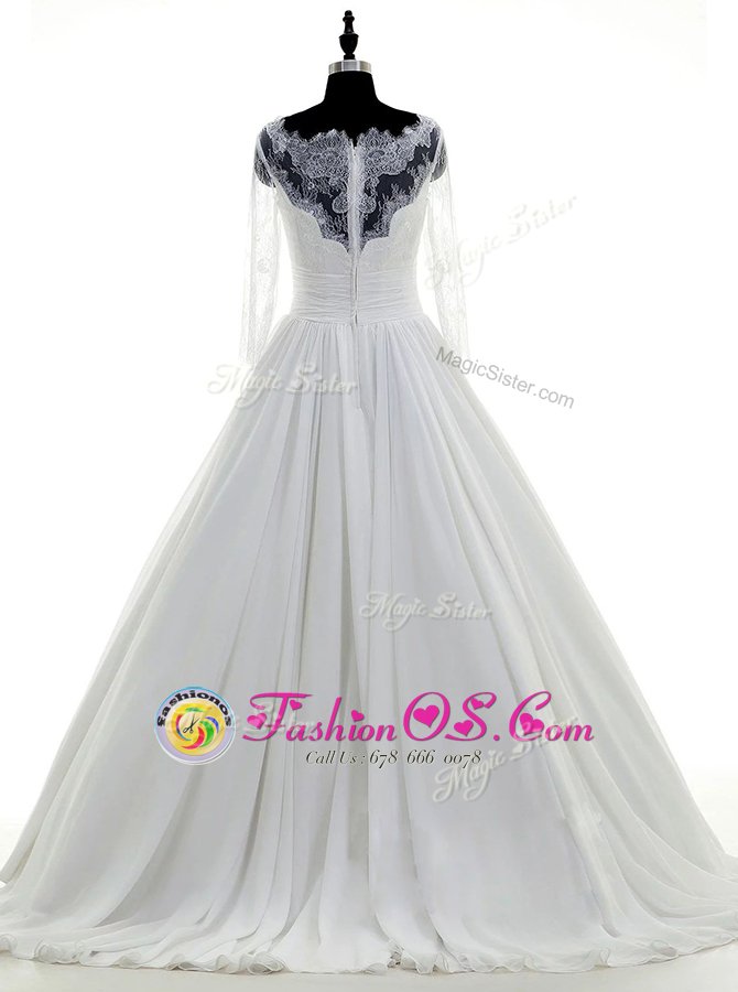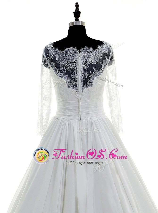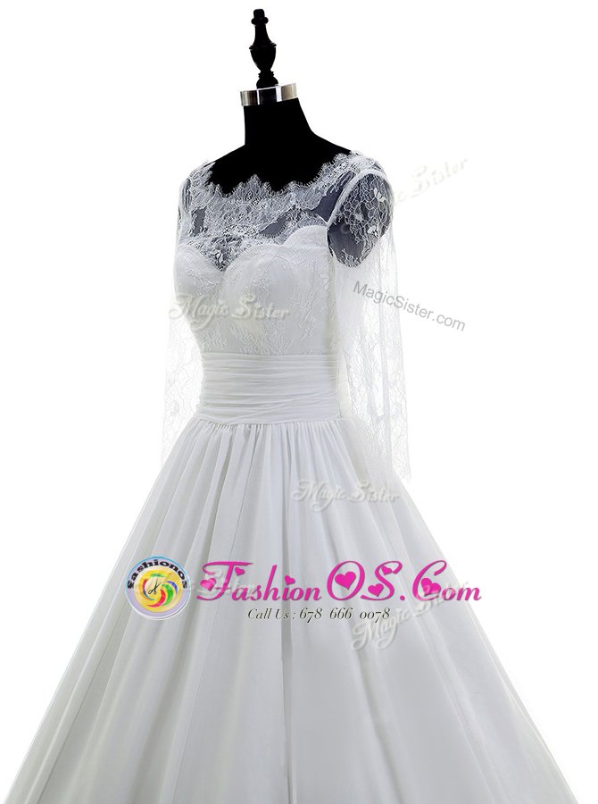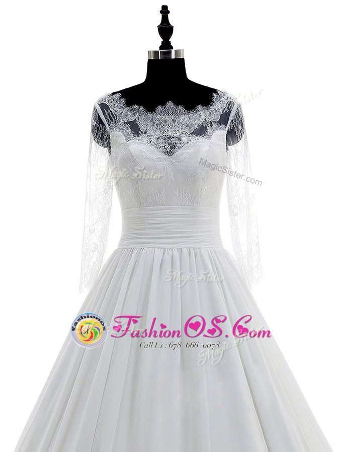 Elegant Scalloped White 3|4 Length Sleeve Chiffon Brush Train Zipper Wedding Gown for Wedding Party