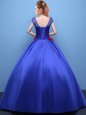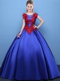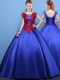 Elegant Scoop Royal Blue Ball Gowns Appliques Quinceanera Gowns Lace Up Satin Cap Sleeves Floor Length