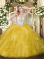Elegant Scoop Sleeveless Quinceanera Gown Floor Length Beading and Ruffles Gold Tulle